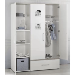 El armario tiene una práctica división ideal para guardar ropa, libros y juguetes. El armario de puerta giratoria tiene tres puertas con tecnología Soft Close, un amplio cajón de extensión total, una barra de ropa y cinco estantes. El armario infantil en blanco con panel superior y adorno en decoración Luna Elm está equipado con asas de alta calidad para colgar en Metal l. El armario ofrece un espacio de almacenamiento extra y está hecho de un tablero de aglomerado revestido de melamina, especialmente resistente.