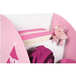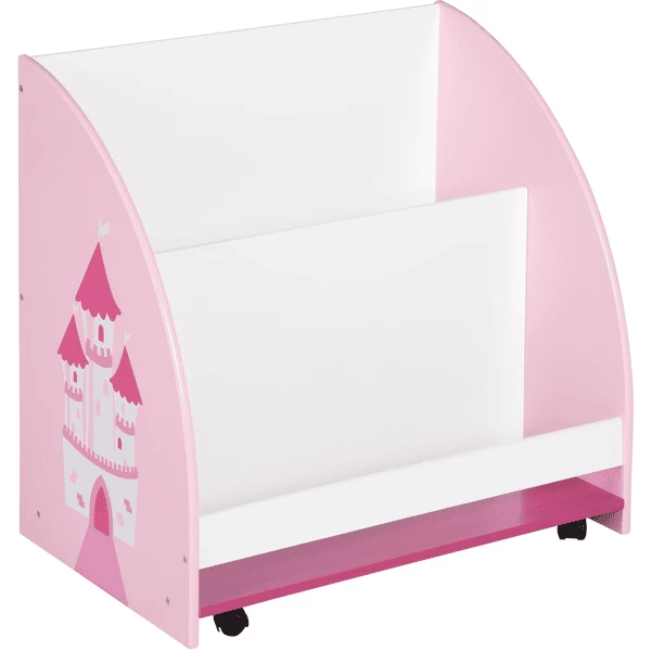 A las niñas les encantará la estantería de juego rosa con el estampado de un castillo de cuento de hadas.