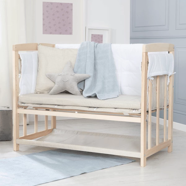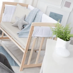 El roba Baby sitter 4 en 1, ‘Liebhabär’ es una cuna, una cuna, una cama de bebé y un banco para niños en uno. La cuna viene con un colchón de espuma, ropa de cama en la linda Design de ‘Liebhabär’, tic-tac, nido acolchado, dosel y varilla de dosel y con corredores para la cuna. La cuna se puede sujetar fácilmente y de forma segura a la cama de los padres con las correas proporcionadas y no puede resbalar. Con un ajuste de altura de 42,5 cm hasta una altura de cama ilimitada, incluyendo camas de resortes, el moisés puede ajustarse óptimamente a la altura del colchón de los padres y fijarse a la cama de los padres con un accesorio flexible e invisible. Por medio de los corredores incluidos, el moisés puede convertirse fácilmente en una cuna. Los textiles diseñados con cariño en el Design «Liebhabär» de la Niñera 4 en 1 ofrecen un clima óptimo para dormir. La ropa de cama de dos piezas consiste en una almohada de 40×35 cm y un edredón de 80×80 cm. La colcha para niños está hecha de un relleno de fibra climática transpirable y de temperatura equilibrada de 100% poliéster. La tela de la cubierta está hecha de 100% algodón. El acolchado se puede usar todo el año y es resistente y fácil de cuidar, ya que el acolchado significa que no resbala al lavarlo. La cuna 4 en 1 de roba es adecuada desde el nacimiento y crece con el niño hasta una cuna para niños mayores. El talento multifuncional también es fácil de montar (aprox. 30 minutos). El moisés, así como el equipo completo, ha sido probado y desarrollado por el TÜV y producido con una barrera de seguridad de acuerdo con los últimos estándares de seguridad de la norma EN 1130:2019. Todos los materiales utilizados en el roba Stubenbett Babysitter 4 in 1 son sometidos a pruebas de sustancias nocivas, certificadas e inspeccionadas regularmente. El moisés «Liebhabär» de roba con barras planas está hecho de madera maciza (haya). La superficie de reposo es de 90 x 45 cm. Dimensiones generales: altura con cubierta 145 cm x anchura (sin/con corredores) 50/76 cm x profundidad 95 cm.