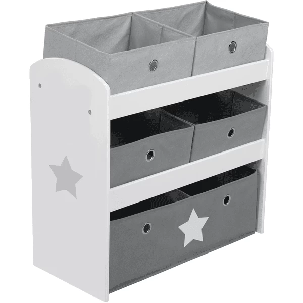 Gracias a las grandes asas en forma de Metal L, las cajas de tela se pueden retirar fácilmente y volver a colocar en el estante de juguetes. La caja de tela más baja y más grande está impresa con una estrella, que hace juego con el motivo de impresión de las partes laterales de la estantería. Con 5 cajas de tela.