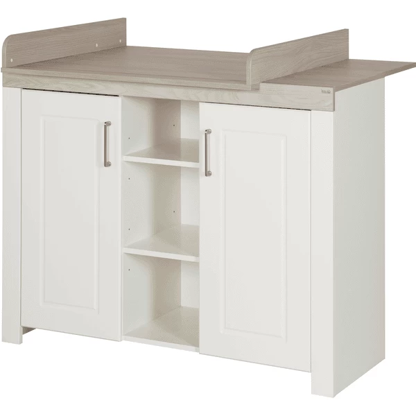 El cambiador de pañales blanco con panel superior en decoración Luna Elm está equipado con un elaborado fresado de casetes, asas de alta calidad Metal y tacos laterales.